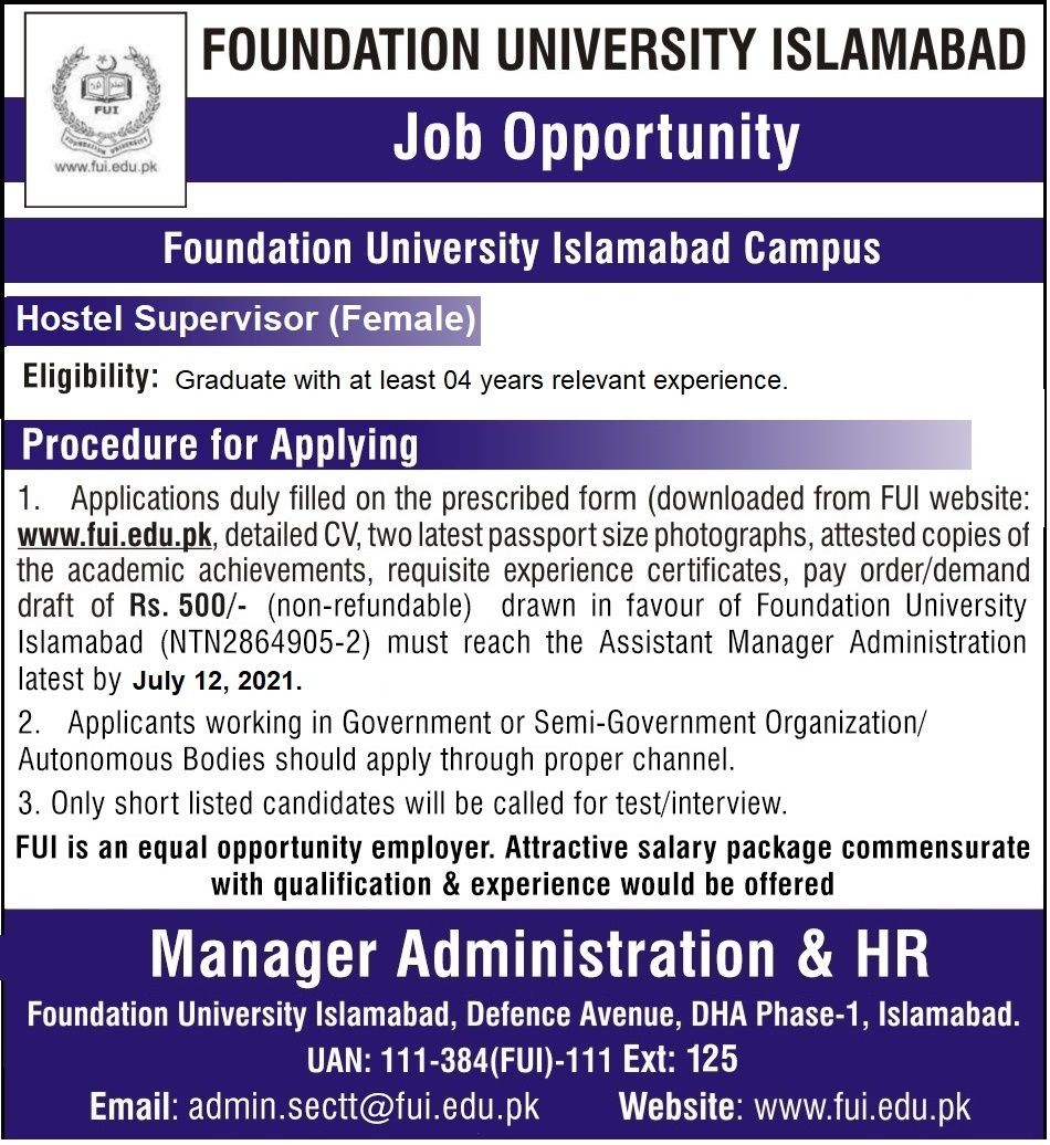 FU - Foundation University Islamabad Jobs, Management Positions June 2021