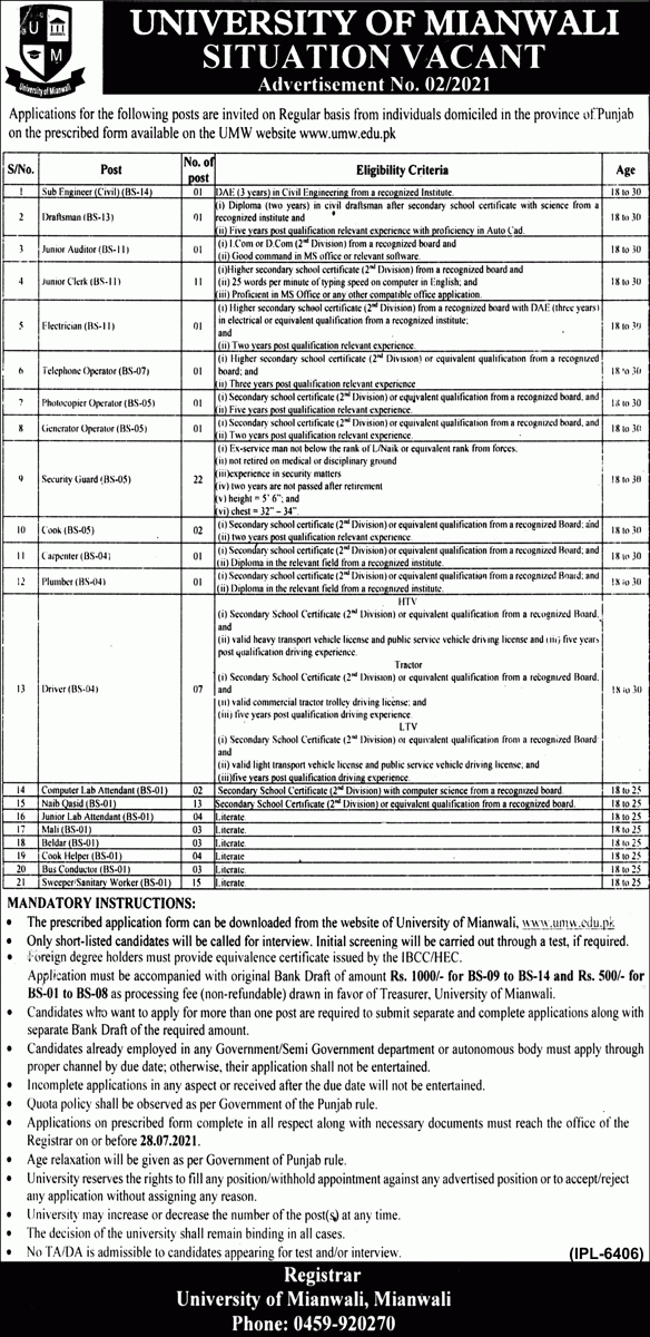 University of Mianwali Jobs, Management Positions July 2021