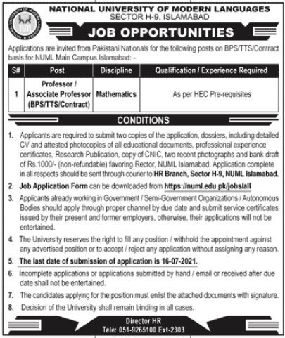 NUML - National University of Modern Languages Jobs, Teaching/Faculty Positions July 2021