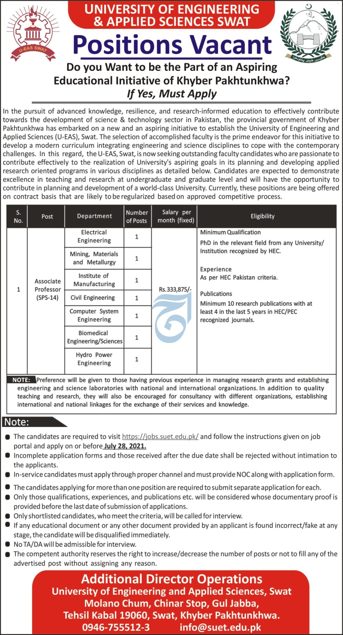 SUET - University of Engineering & Technology Swat Jobs, Teaching/Faculty Positions July 2021