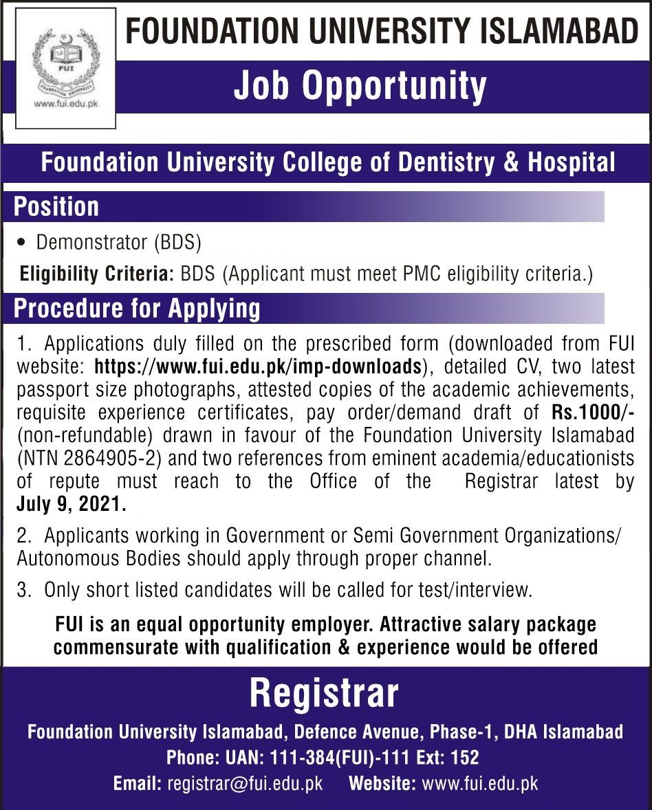 FU - Foundation University Islamabad Jobs, Management Position July 2021
