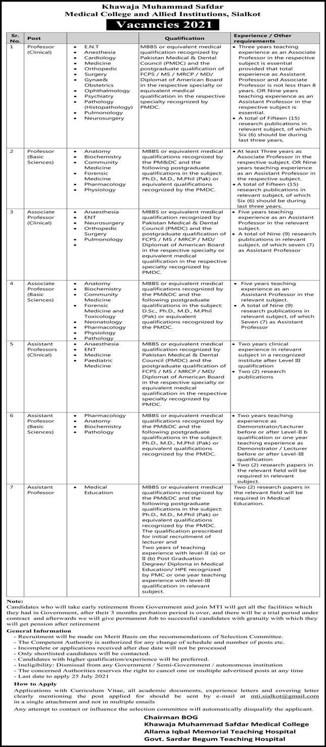 KMSMC - Khawaja Muhammad Safdar Medical College Jobs, Teaching/Faculty Positions July 2021
