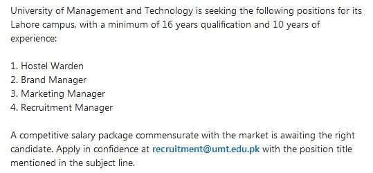 UMT - University of Management & Technology Jobs, Management Positions July 2021