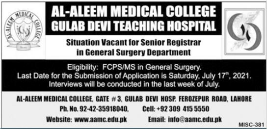 AAMC - Al-Aleem Medical College Jobs, Management Positions July 2021
