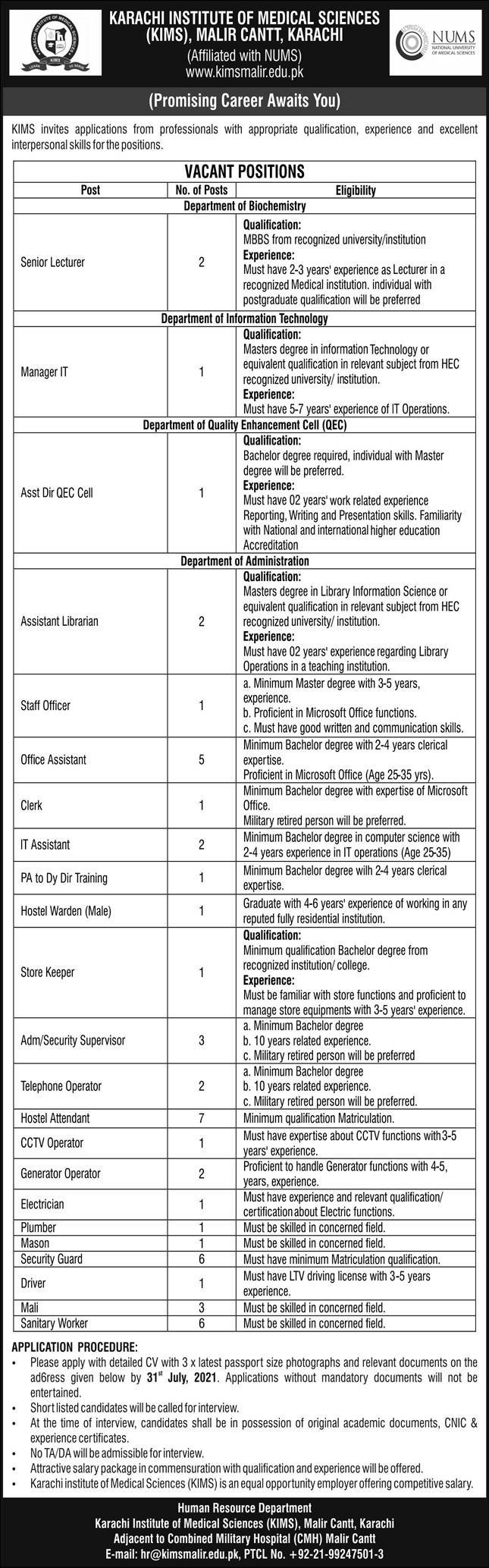 Karachi Institute of Medical Sciences Jobs, Teaching/Faculty & Management Positions July 2021