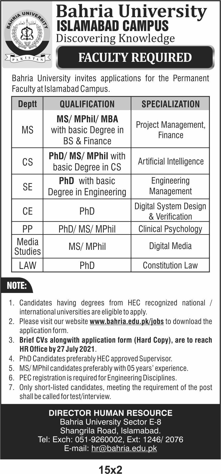 Bahria University Jobs, Teaching/Faculty Positions July 2021