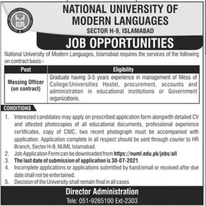 NUML - National University of Modern Languages Jobs, Management Positions July 2021