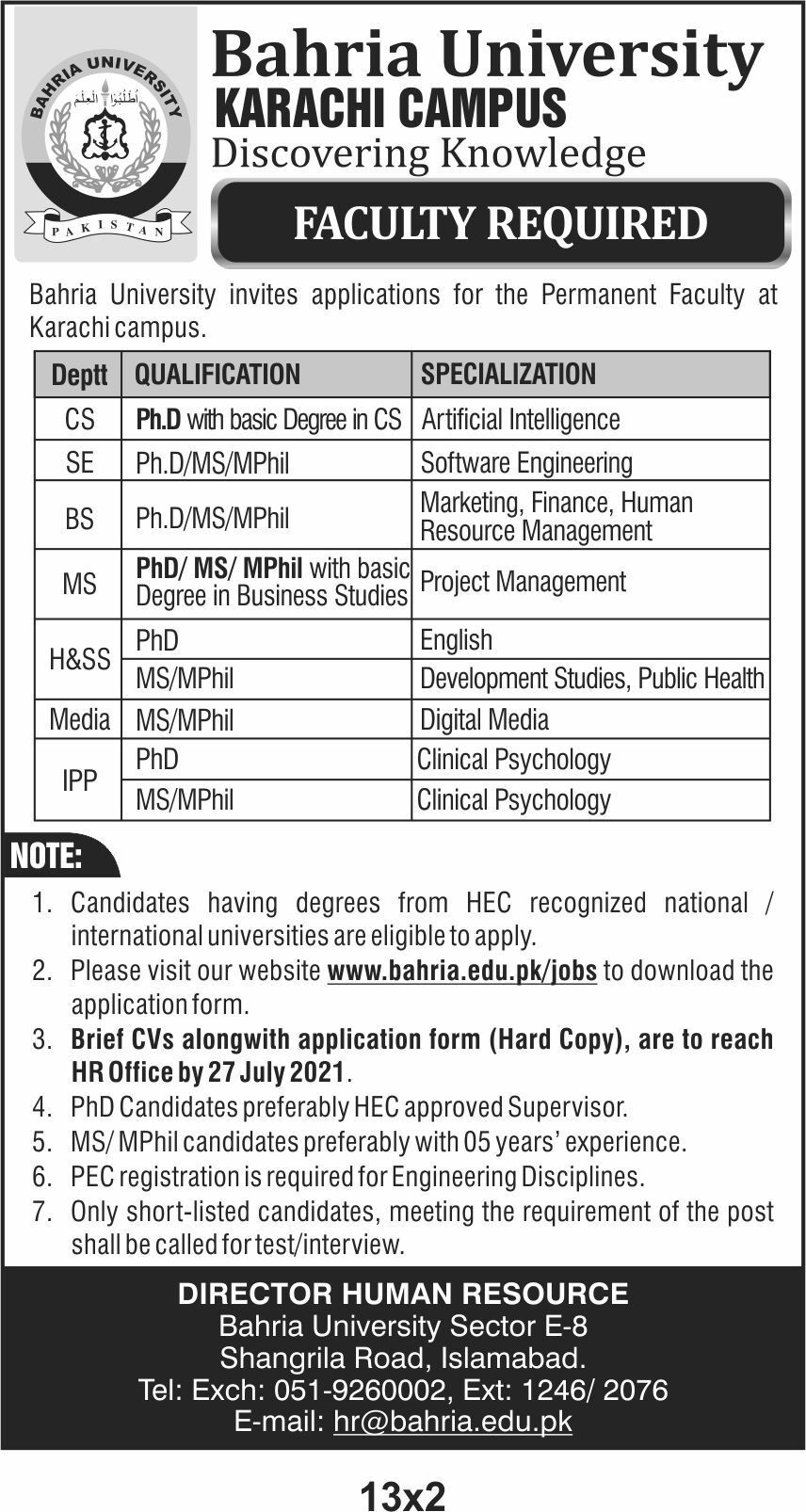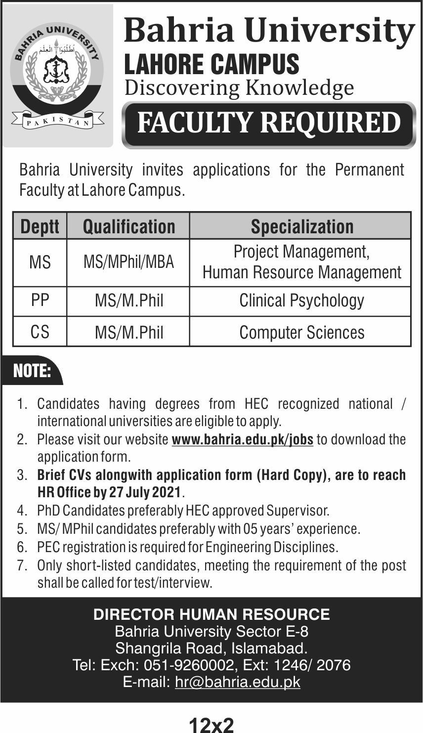 Bahria University Jobs, Teaching/Faculty Positions July 2021