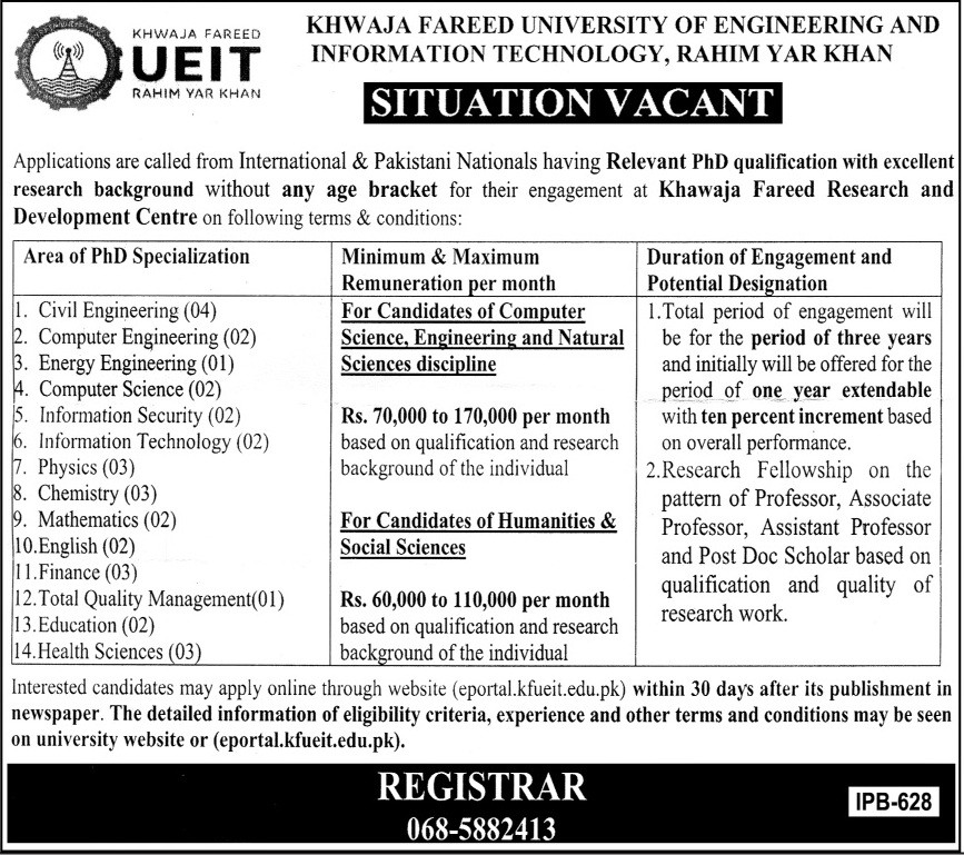KFUEIT - Khwaja Fareed University of Engineering and Information Technology Jobs, Teaching/Faculty Positions July 2021