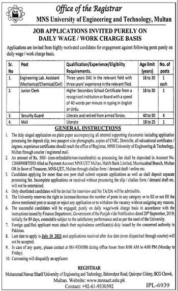 Muhammad Nawaz Sharif University of Engineering & Technology, Multan Jobs, Management Positions July 2021