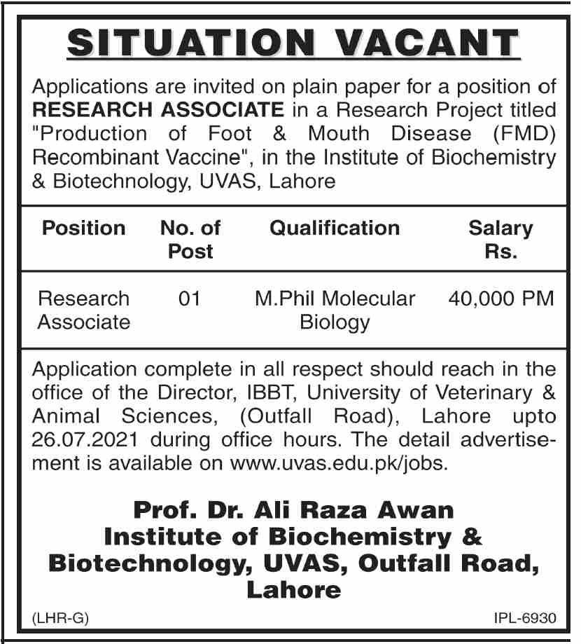 University of Veterinary & Animal Sciences Jobs, Teaching/Faculty Positions July 2021