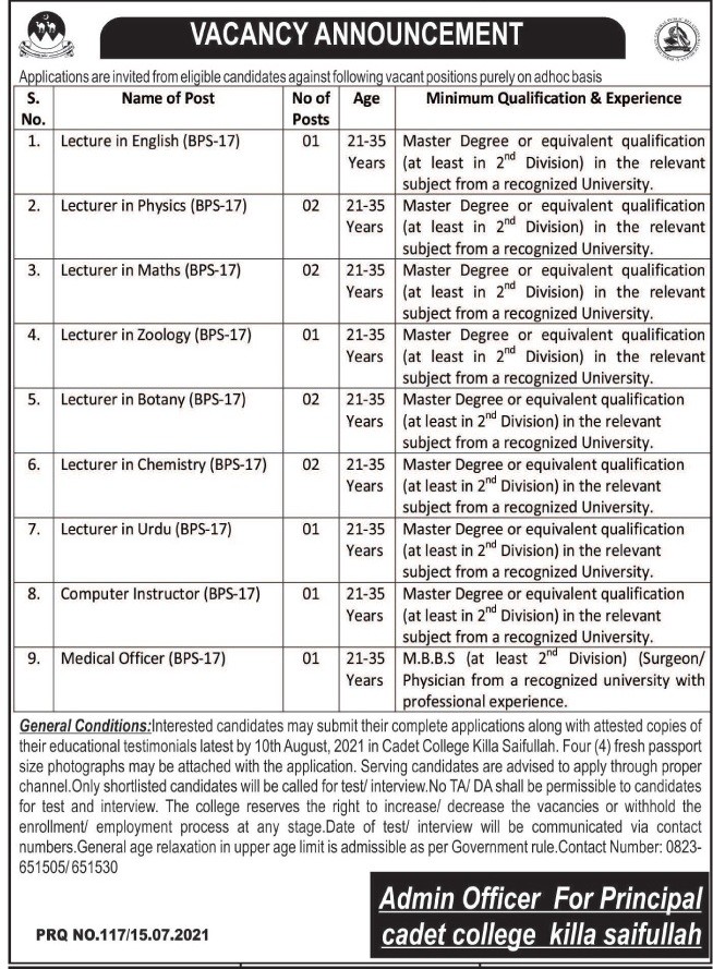 Cadet College Killa Saifullah Jobs, Teaching/Faculty Positions July 2021