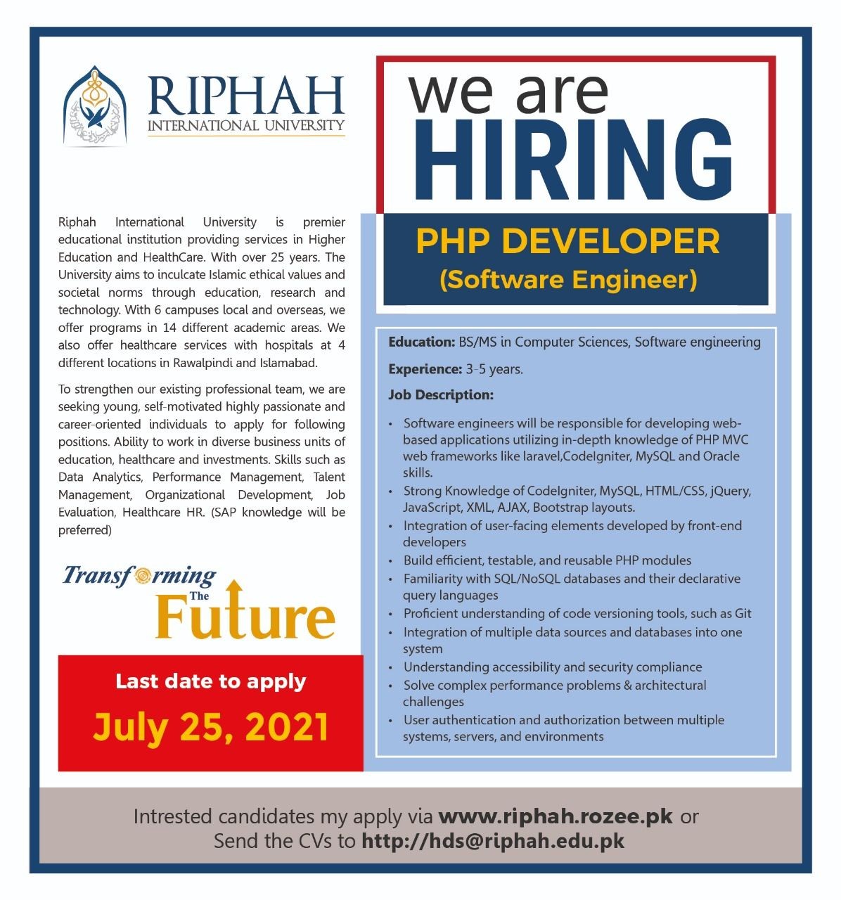 Intrested candidates my apply via www.riphah.rozee.pk or Send the CVs to http://hds@riphah.edu.pk