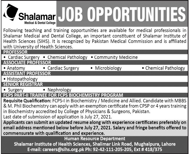 Human Resource Department Shalamar Institute of Health Sciences, Shalimar Link Road, Mughalpura, Lahore E-mail: careers@sihs.org.pk Ph: 92-42-111-205-205, Ext # 418/375