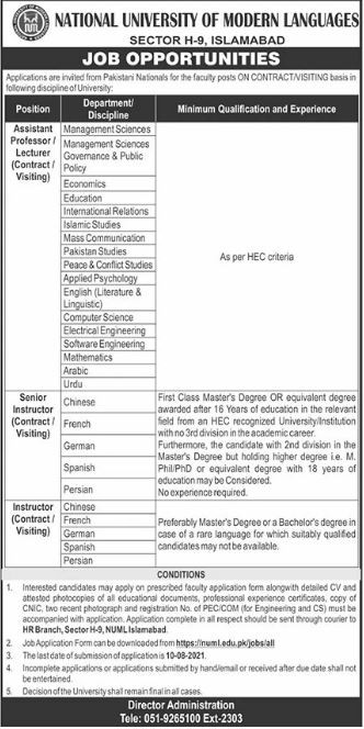NUML - National University of Modern Languages Jobs, Teaching/Faculty Positions July 2021