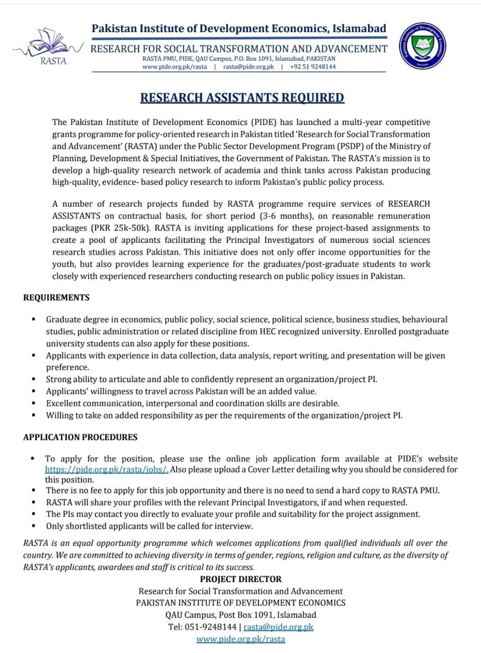 • To apply for the position, please use the online job application form available at PIDE's website 10190://pide.org.nk/rastaiiohs/. Also please upload a Cover Letter detailing why you should be considered for this position. • There is no fee to apply for this job opportunity and there is no need to send a hard copy to RASTA PMU. • RASTA will share your profiles with the relevant Principal Investigators, if and when requested. • The Pls may contact you directly to evaluate your profile and suitability for the project assignment • Only shortlisted applicants will be called for interview. RASTA loon equal opportunity programme which welcomes applications from qualified individuals all over the country. We are committed to achieving diversity in terms ofgender, regions, religion and culture, as the diversity of RAS7'A's applicants, awardees and staff is critical to its success. PROJECT DIRECTOR Research for Social Transformation and Advancement PAKISTAN INSTITUTE OF DEVELOPMENT ECONOMICS QAU Campus, Post Box 1091, Islamabad Tel: 051-9248144