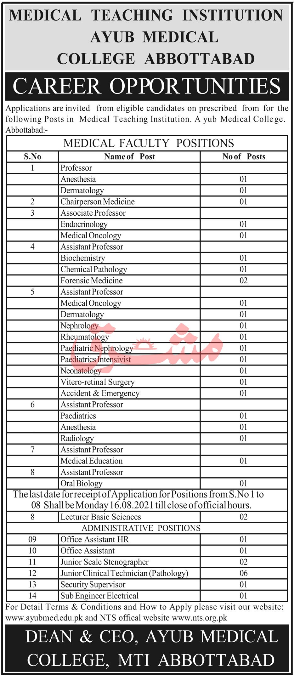 Applications are invited from eligible candidates on prescribed from for the following Posts in Medical Teaching Institution. A yub Medical College. Abbottabad