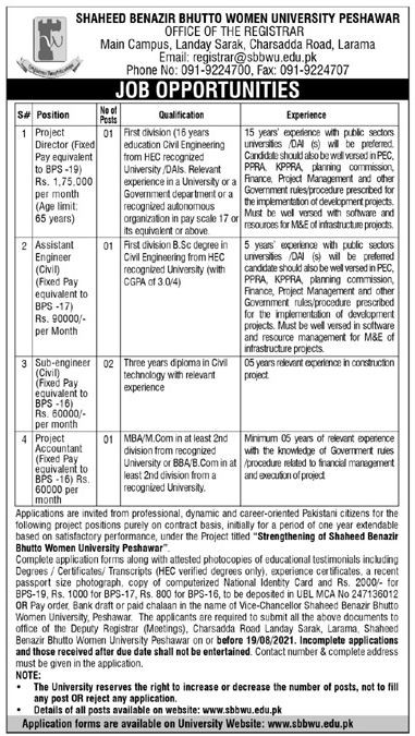 Shaheed Benazir Bhutto Women University Jobs, Management Positions July 2021