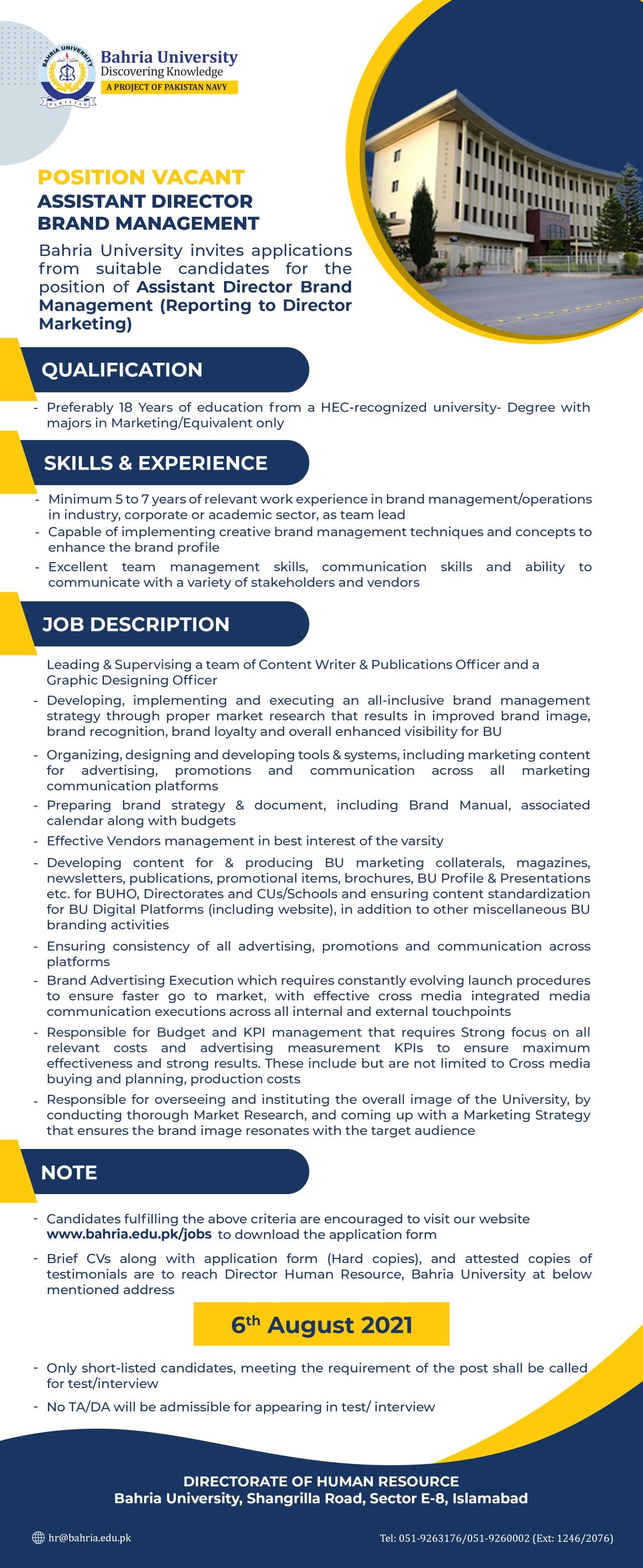 Bahria University invites applications from suitable candidates for the position of Assistant Director Brand Management (Reporting to Director Marketing)