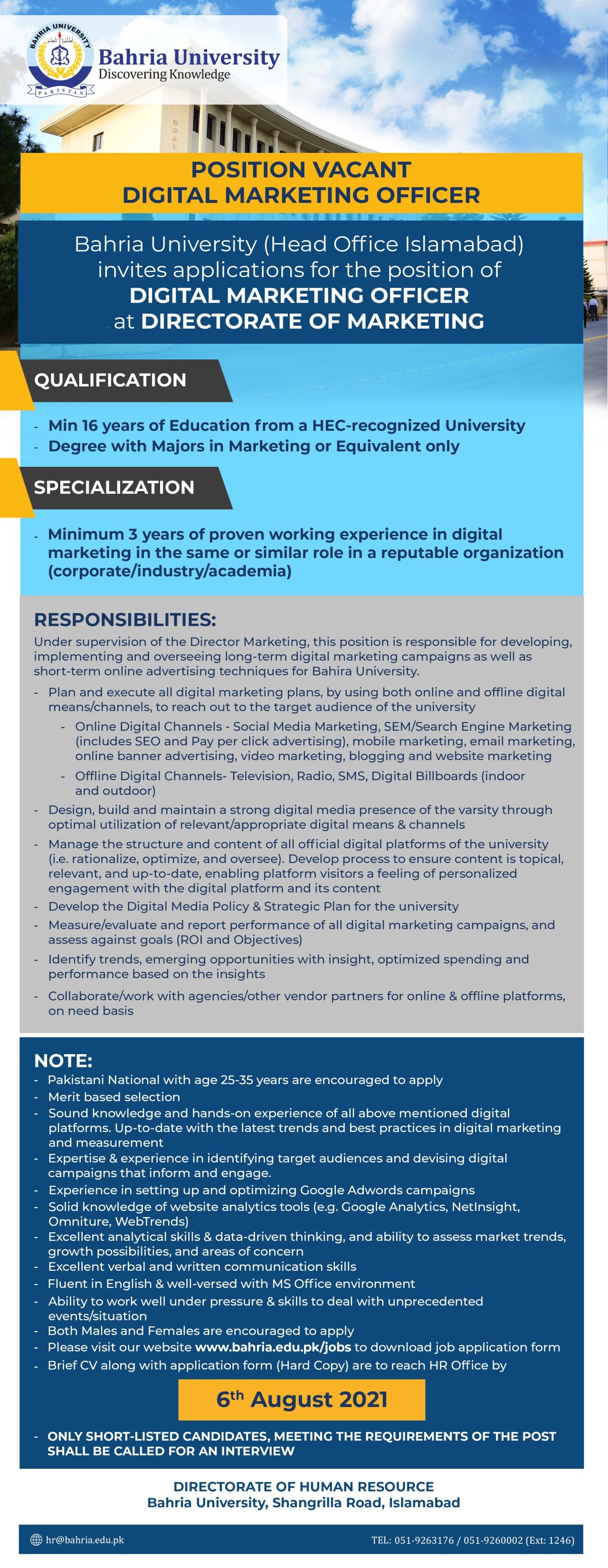Bahria University (Head Office Islamabad) invites applications for the position of DIGITAL MARKETING OFFICER at DIRECTORATE OF MARKETING