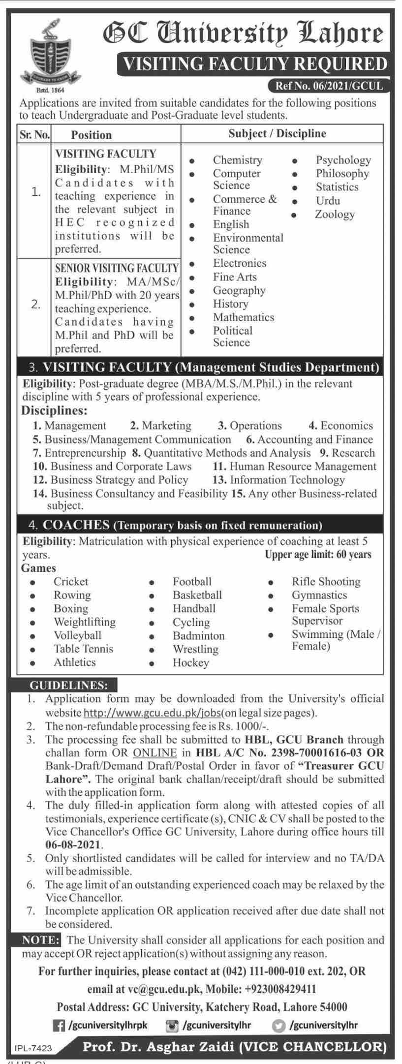 GC University of Lahore Jobs, Teaching/Faculty Positions July 2021