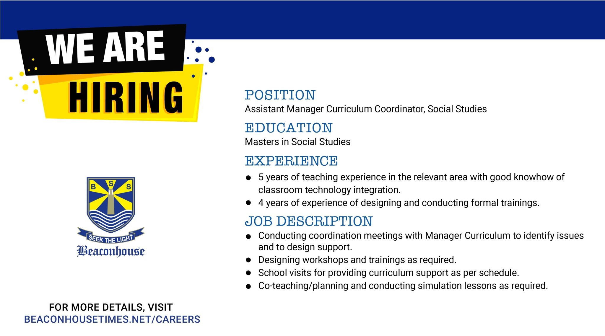 FOR MORE DETAILS, VISIT BEACON HOUSE TIM ES.N ET/CAREERS