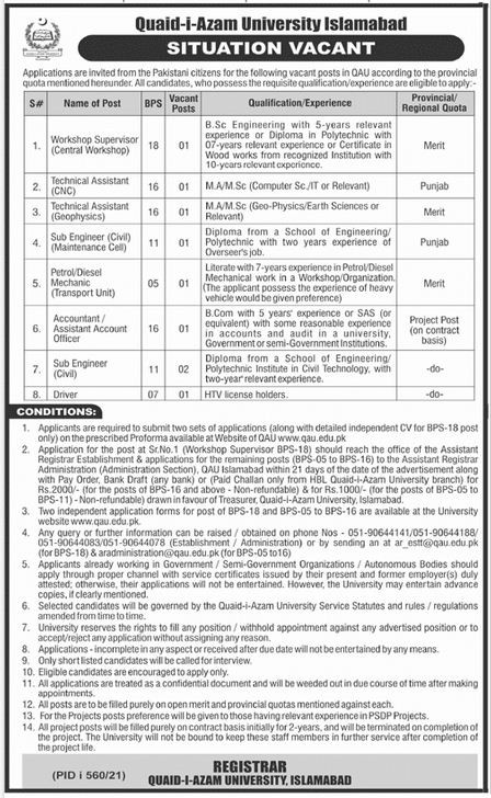 Quaid-e-Azam University Jobs, Management Positions July 2021