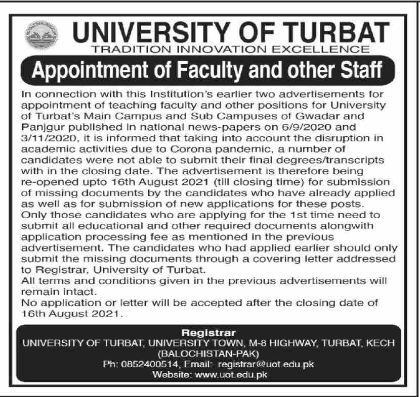 In connection with this Institution's earlier two advertisements for appointment of teaching faculty and other positions for University of Turbat's Main Campus and Sub Campuses of Gwadar and Panjgur published in national news-papers on 6/9/2020 and 3/11/2020, it is informed that taking into account the disruption in academic activities due to Corona pandemic, a number of candidates were not able to submit their final degrees/transcripts with in the closing date. The advertisement is therefore being re-opened upto 16th August 2021 (till closing time) for submission of missing documents by the candidates who have already applied as well as for submission of new applications for these posts. Only those candidates who are applying for the 1st time need to submit all educational and other required documents aiongwith application processing fee as mentioned In the previous advertisement. The candidates who had applied earlier should only submit the missing documents through a covering letter addressed to Registrar, University of Turbat. All terms and conditions given in the previous advertisements will remain intact. No application or letter will be accepted after the closing date of 16th August 2021.