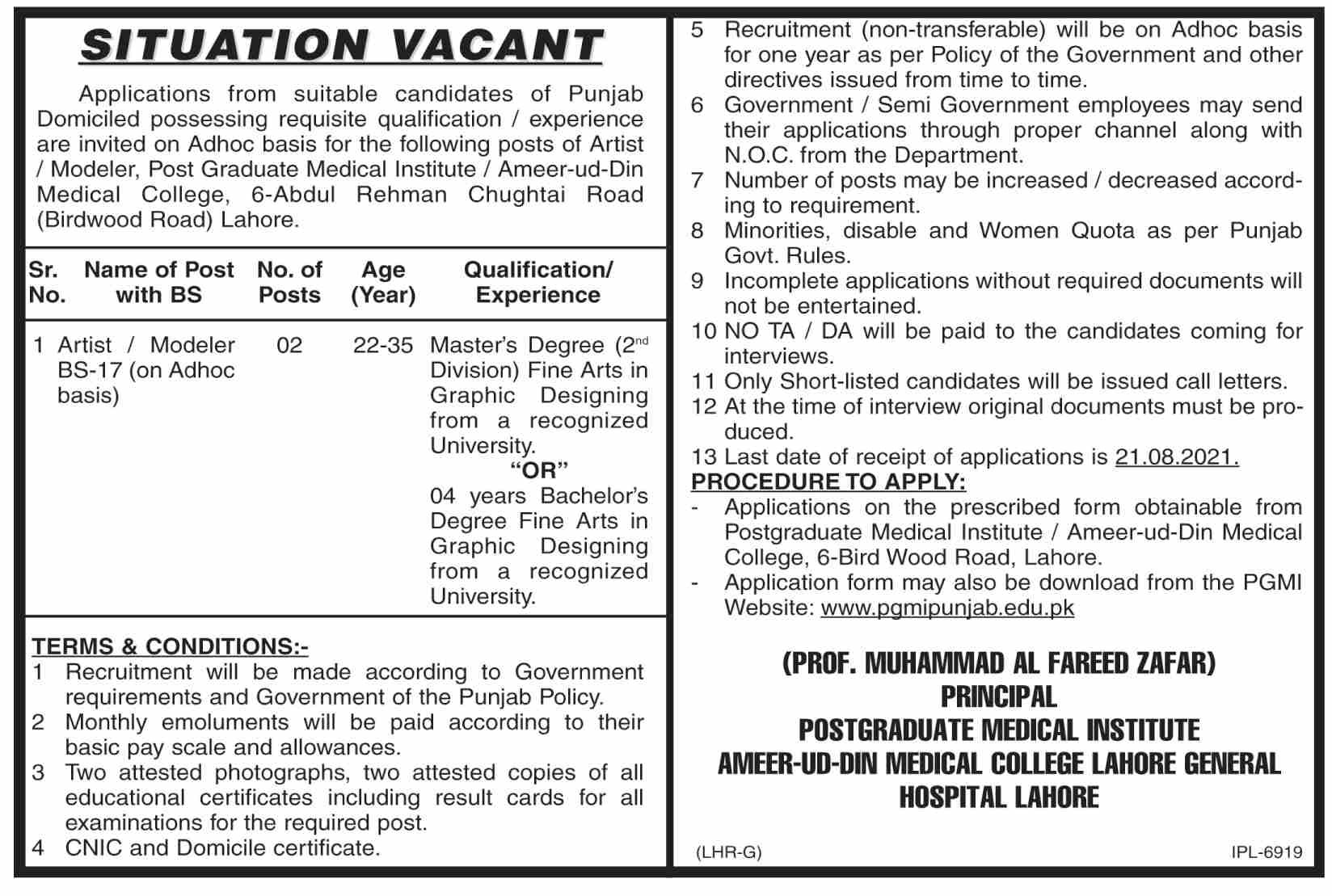 Applications from suitable candidates of Punjab Domiciled possessing requisite qualification / experience are invited on Adhoc basis for the following posts of Artist / Modeler. Post Graduate Medical Institute / Ameer-ud-Din Medical College, 6-Abdul Rehman Chughtai Road (Birdwood Road) Lahore.