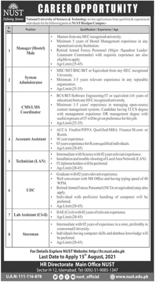 NUST - National University of Sciences and Technology Jobs, Management Positions August 2021