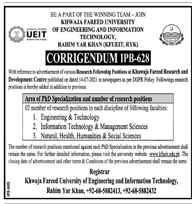 With reference to advertisement of various Research Fellowship Positions at Khawaja Fareed Research and Development Centre published on dated 14-07-2021 in newspapers as per DGPR Policy. Followings research positions is hereby added in addition to previous: