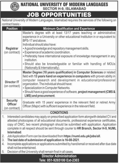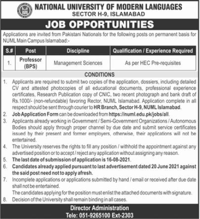 NUML - National University of Modern Languages Jobs, Teaching/Faculty & Management Positions August 2021