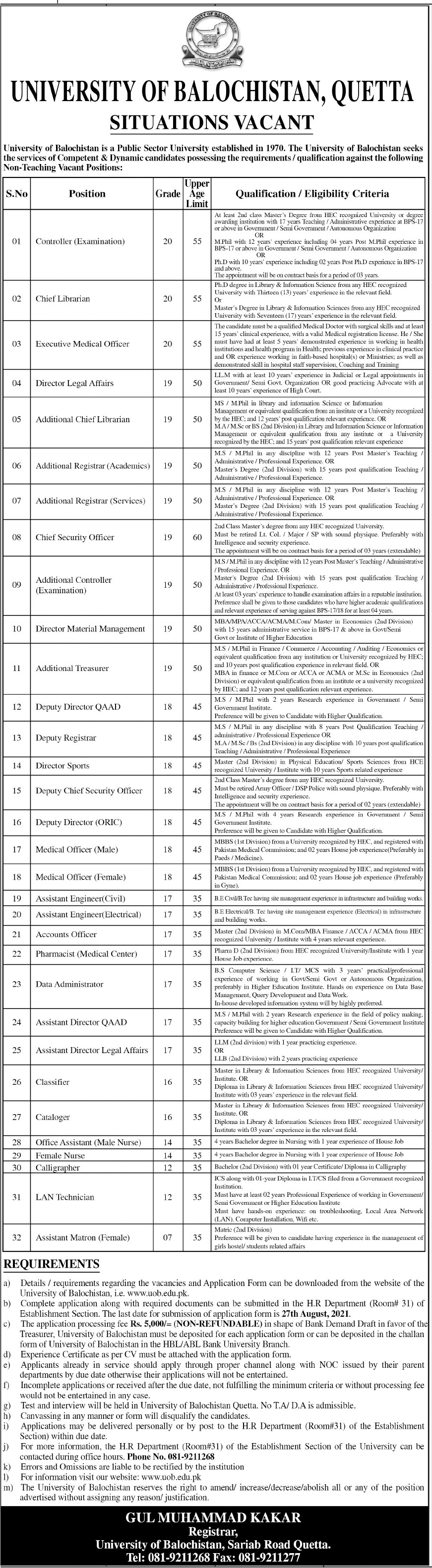 REQUIREMENTS a) Details / requirements regarding the vacancies and Application Form can be downloaded from the website of the University of Balochistan, i.e. www.uob.edu.pk. b) Complete application along with required documents can be submitted in the H.R Department (Room# 31) of Establishment Section. The last date for submission of application form is 27th August, 2021. c) The application processing fee Rs. 5,0001= (NON-REFUNDABLE) in shape of Bank Demand Draft in favor of the Treasurer, University of Balochistan must be deposited for each application form or can be deposited in the challan form of University of Balochistan in the HBL/ABL Bank University Branch. d) Experience Certificate as per CV must be attached with the application fonn. e) Applicants already in service should apply through proper channel along with NOC issued by their parent departments by due date otherwise their applications will not be entertained. 0 Incomplete applications or received after the due date, not fulfilling the minimum criteria or without processing fee would not be entertained in any case. g) Test and interview will be held in University of Balochistan Quetta. No TA/ D.A is admissible. h) Canvassing in any manner or form will disqualify the candidates. i) Applications may be delivered personally or by post to the H.R Department (Room#31) of the Establishment Section) within due date. j) For more information, the H.R Department (Room#31) of the Establishment Section of the University can be contacted during office hours. Phone No. 081-9211268 k) Errors and Omissions are liable to be rectified by the institution 1) For information visit our website: www.uob.edu.pk m) The University of Balochistan reserves the light to amend/ increase/decrease/abolish all or any of the position advertised without assigning any reason/ justification.
