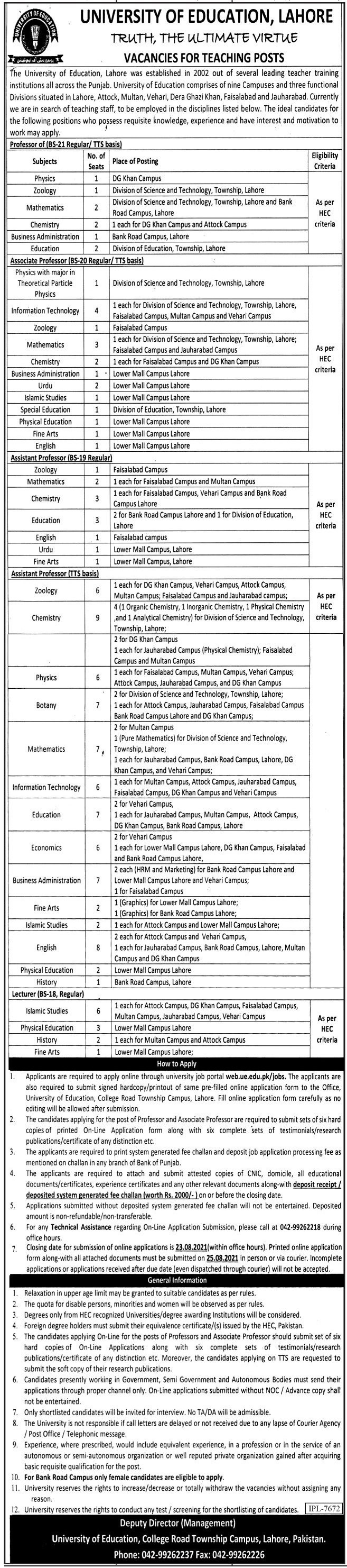The University of Education, Lahore was established in 2002 out of several leading teacher training institutions all across the Punjab. University of Education comprises of nine Campuses and three functional Divisions situated in Lahore, Attack, Multan, Vehari, Dera Ghazi Khan, Faisalabad and Jauharabad. Currently we are in search of teaching staff, to be employed in the disciplines listed below. The ideal candidates for the following positions who possess requisite knowledge, experience and have interest and motivation to work may apply.