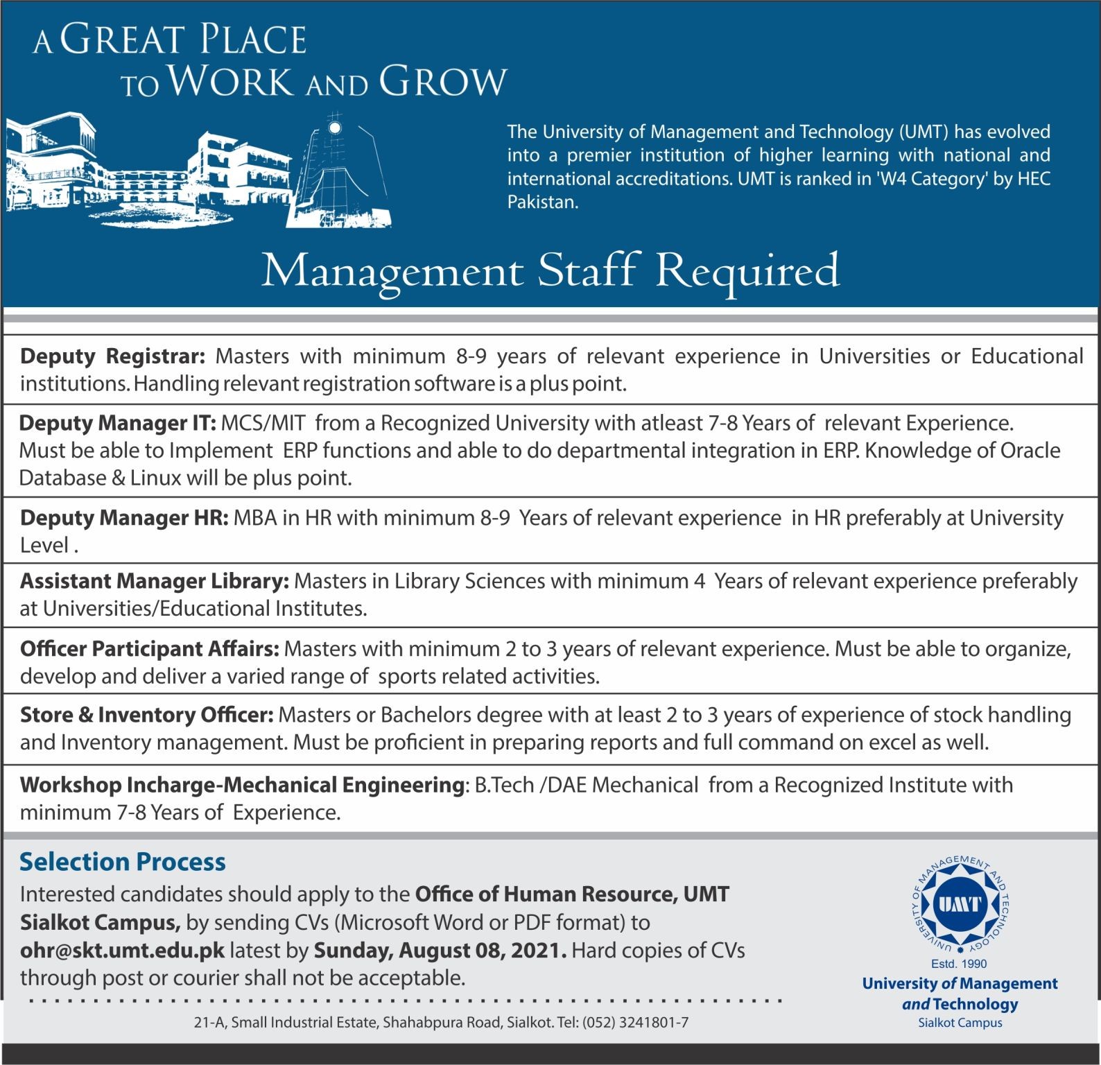 Selection Process Interested candidates should apply to the Office of Human Resource, UMT Sialkot Campus, by sending CVs (Microsoft Word or PDF format) to ohr@skt.umt.edu.pk latest by Sunday, August 08, 2021. Hard copies of CVs through post or courier shall not be acceptable.