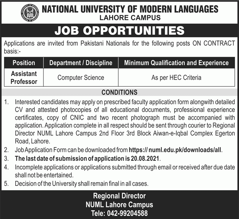 CONDITIONS 1. Interested candidates may apply on prescribed faculty application form along with detailed CV and attested photocopies of all educational documents, professional experience certificates, copy of CNIC and two recent photograph must be accompanied with application. Application complete in all respect should be sent through courier to Regional Director NUML Lahore Campus 2nd Floor 3rd Block Aiwan-e-lqbal Complex Egret on Road, Lahore. 2. Job Application Form can be downloaded from https:// numl.edu.pk/downloads/all. 3. The last date of submission of application is 20.08.2021. 4. Incomplete applications or applications submitted through email or received after due date shall not be entertained. 5. Decision of the University shall remain final in all cases.