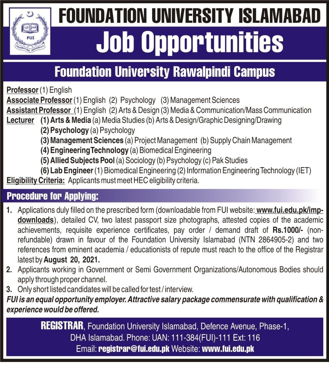 1. Applications duly filled on the prescribed form (downloadable from FUI website: www.fui.edu.pk/imp-downloads), detailed CV, two latest passport size photographs, attested copies of the academic achievements, requisite experience certificates, pay order / demand draft of Rs.1000/- (non-refundable) drawn in favour of the Foundation University Islamabad (NTN 2864905-2) and two references from eminent academia / educationists of repute must reach to the office of the Registrar latest by August 20, 2021.