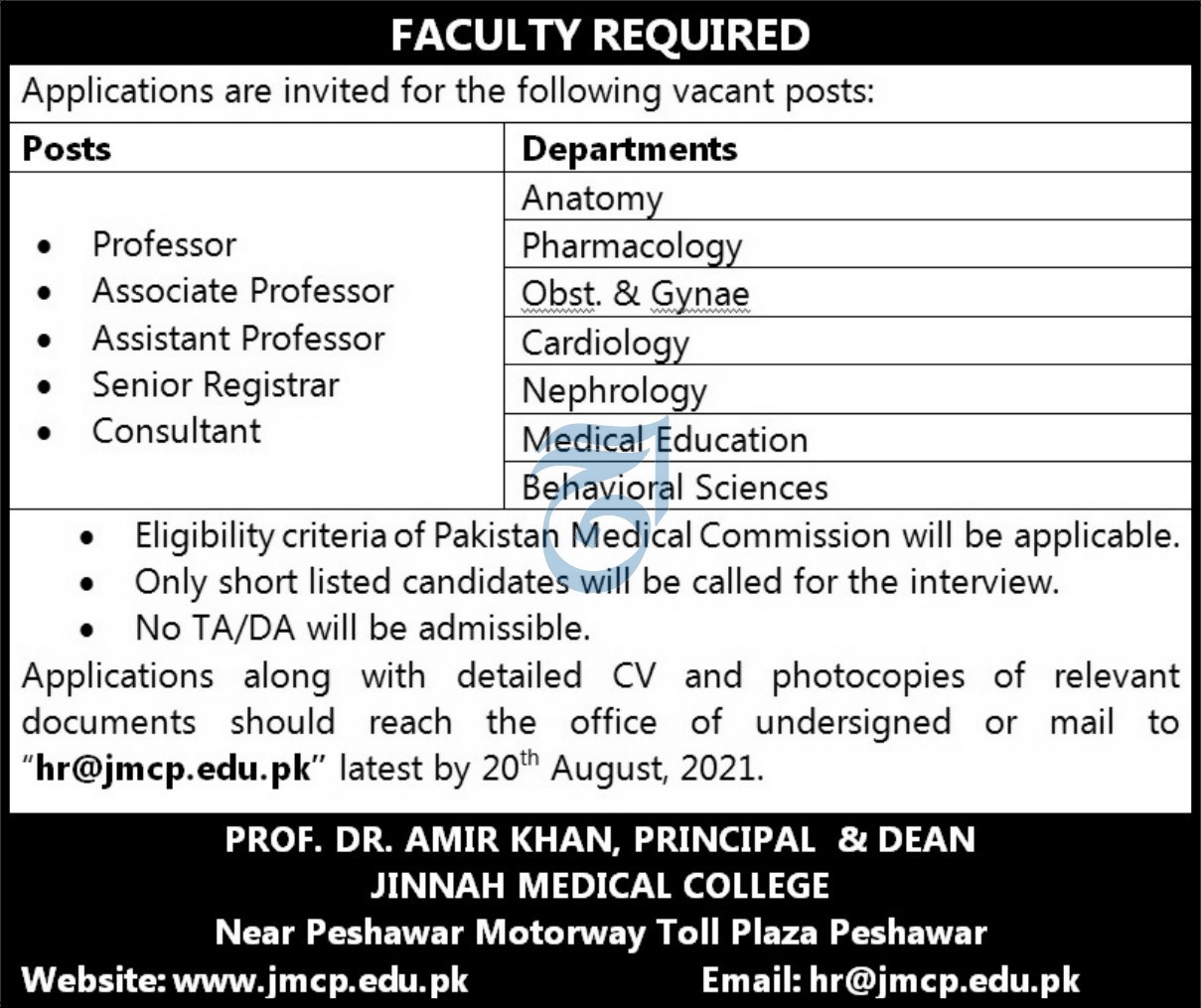 • No TA/DA will be admissible. Applications along with detailed CV and photocopies of relevant documents should reach the office of undersigned or mail to "hr@jmcp.edu.pk" latest by 20th August, 2021.