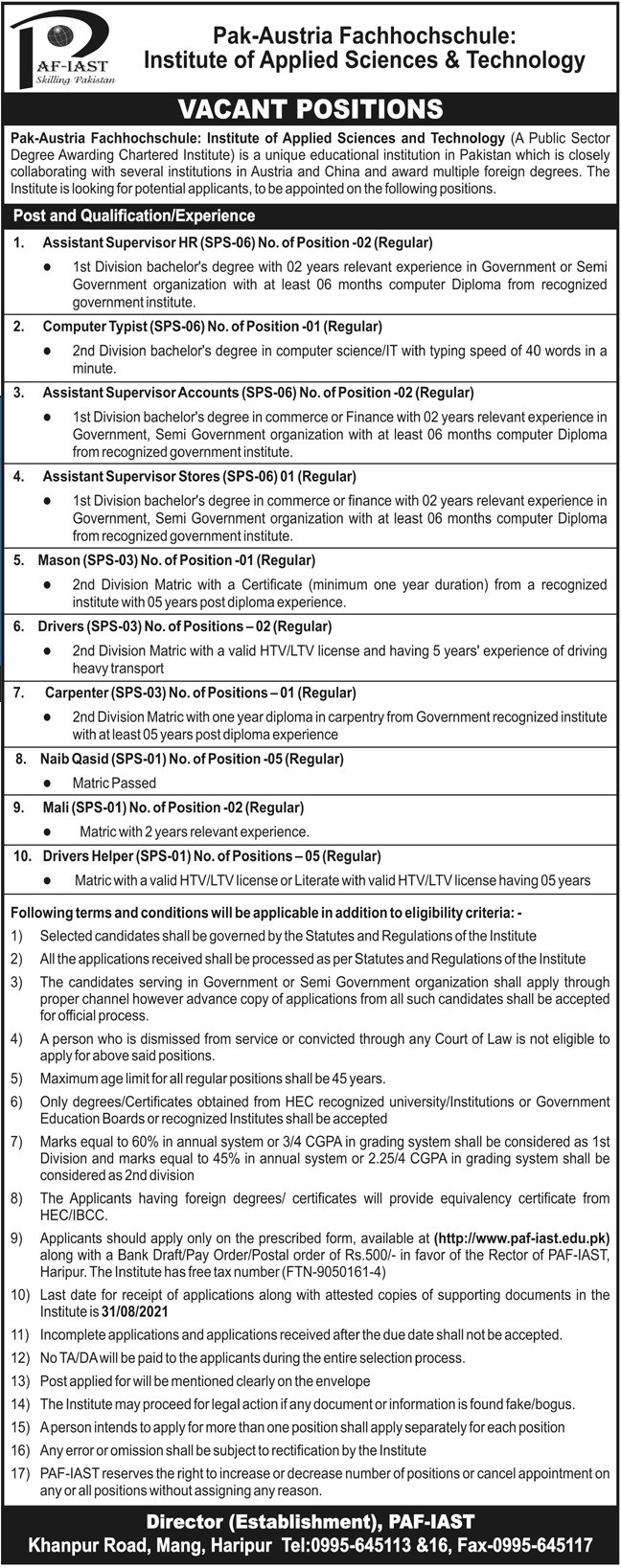 16) Any error or omission shall be subject to rectification by the Institute 17) PAF-IAST reserves the right to increase or decrease number of positions or cancel appointment on any or all positions without assigning any reason.