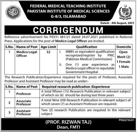 Reference advertisement No PID(1) 481/21 dated 24.07.2021 published in National Press. Applications for the post of Medico Legal Officer are invited.