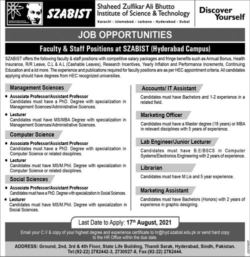 ZABIST - Shaheed Zulfikar Ali Bhutto Institute of Science and Technology Jobs, Teaching/Faculty & Management Positions August 2021