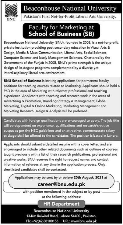 Beacon house National University (BNU), founded in 2003, is a not for profit, private institution providing post-secondary education in Visual Arts & Design, Media & Mass Communication, Liberal Arts, Social Sciences, Computer Science and lately Management Sciences. Chartered by the Government of the Punjab in 2005, BNU's prime strength is the unique design of its degree programs complemented by a diverse yet interdisciplinary liberal arts environment. BNU School of Business is inviting applications for permanent faculty positions for teaching courses related to Marketing. Applicants should hold a PhD in the area of Marketing with relevant professional and teaching experience. Applicants with teaching and research work in the areas of Advertising & Promotion, Branding Strategy & Management, Global Marketing, Digital & Online Marketing, Marketing Management and Marketing Research Design & Analysis will be preferred.