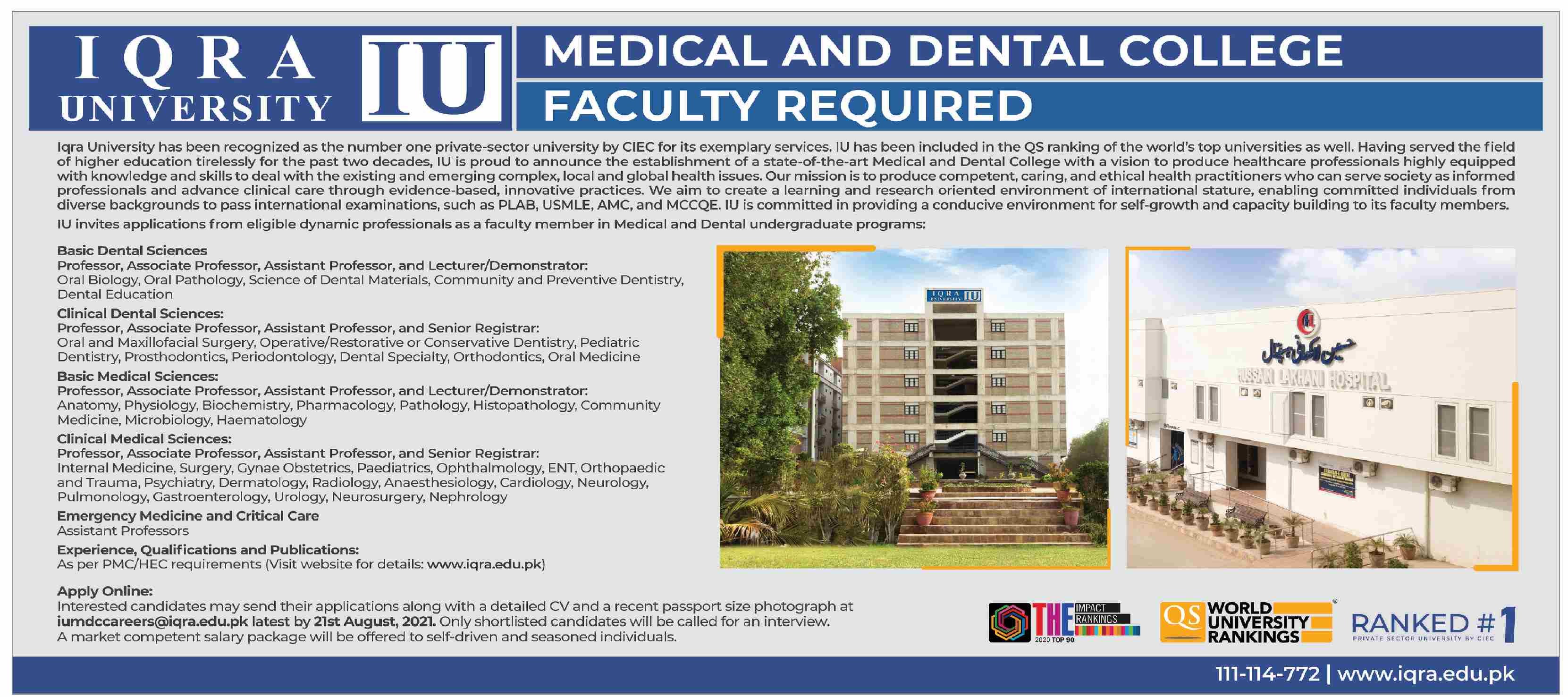 Internal Medicine, Surgery, Gynae Obstetrics, Paediatrics, Ophthalmology, ENT. Orthopaedic and Trauma, Psychiatry, Dermatology, Radiology, Anaesthesiology, Cardiology, Neurology, Pulmonology, Gastroenterology, Urology, Neurosurgery, Nephrology Emergency Medicine and Critical Care Assistant Professors Experience, Qualifications and Publications: As per PMC/HEC requirements (Visit website for details: wvvw.igratedu.pk) Apply Online: Interested candidates may send their applications along with a detailed CV and a recent passport size photograph at iumdccareers@iqra.edu.pk latest by 21st August, 2021. Only short listed candidates will be called for an interview. A market competent salary package will be offered to self-driven and seasoned individuals.