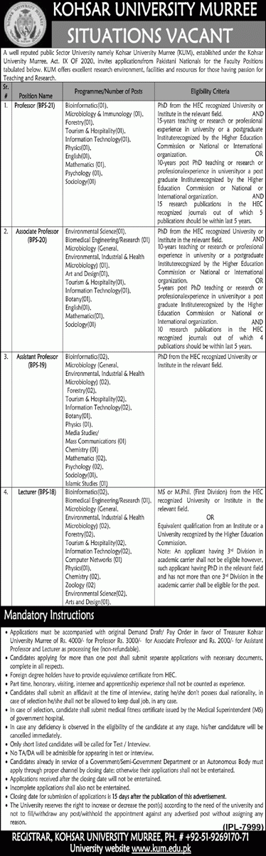 Kohsar University Murree Jobs, Teaching/Faculty Positions August 2021
