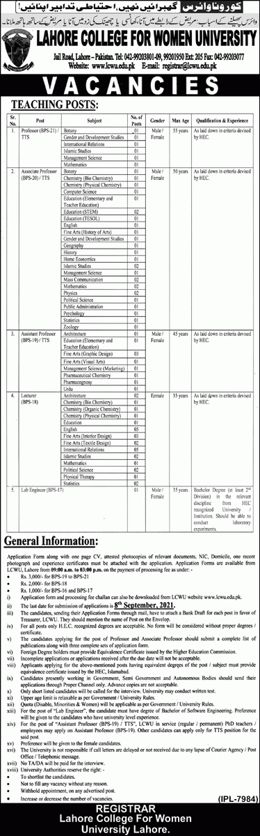 LCWU - Lahore Collge for Women University Jobs, Teaching/Faculty Positions August 2021