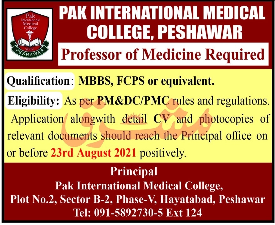 As per PM&DC/PMC rules and regulations. Application alongwith detail CV and photocopies of relevant documents should reach the Principal office on or before 23rd August 2021 positively.