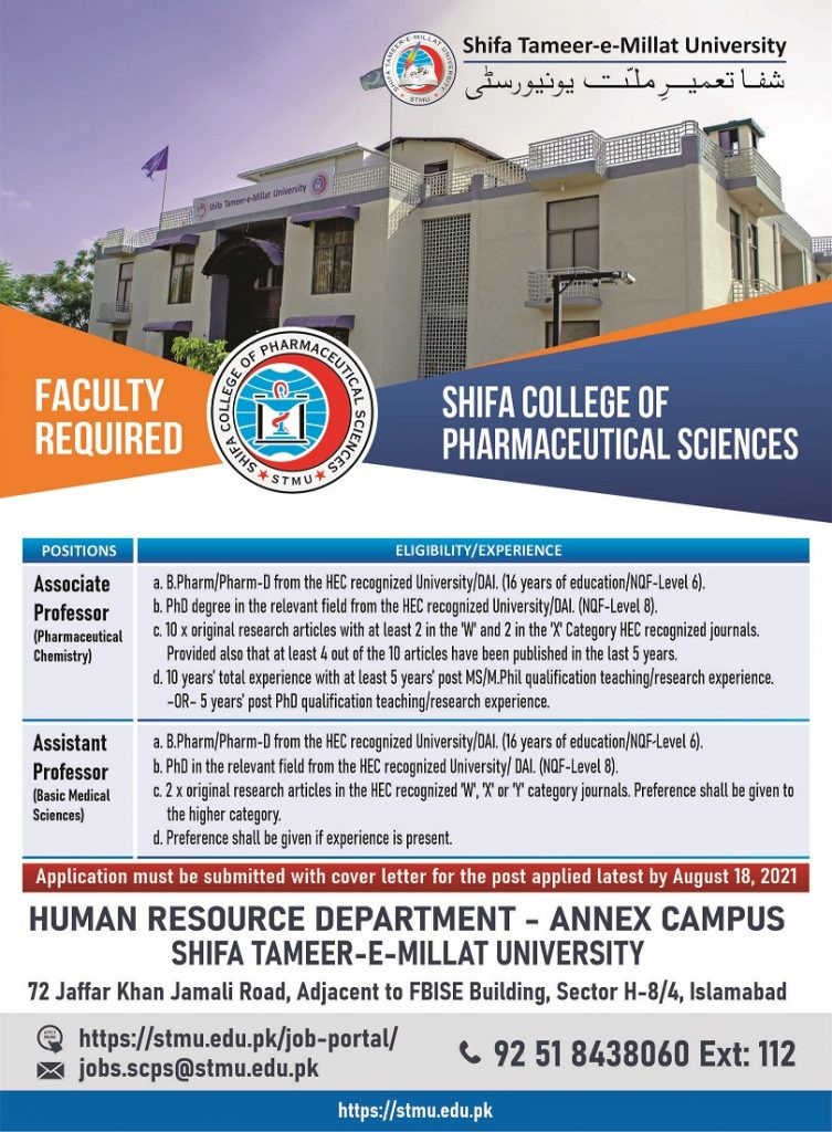 HUMAN RESOURCE DEPARTMENT - ANNEX CAMPUS SHIFA TAMEER-E-MILLAT UNIVERSITY 72 Jaffar Khan Jamali Road, Adjacent to FBISE Building, Sector H-8/4, Islamabad Q https://stmu.edu.pk/job-portal