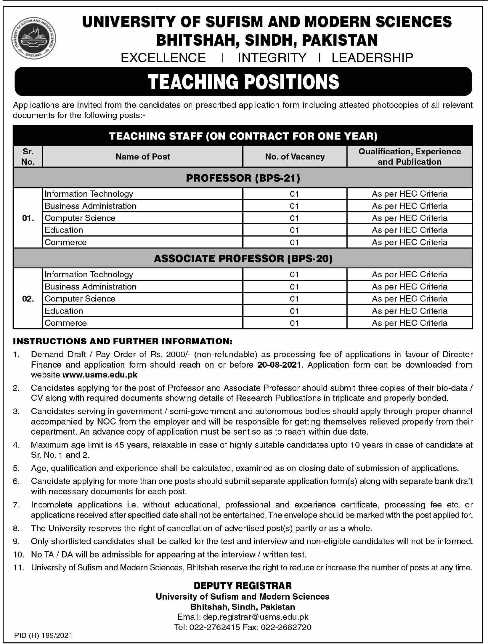 10. No TA / DA will be admissible for appearing at the interview / written test. 11. University of Sufism and Modern Sciences, Bhitshah reserve the right to reduce or increase the number of posts at any time.