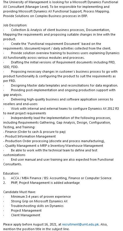The University of Management is looking for a Microsoft Dynamics Functional AX Consultant (Manager Level). To be responsible for implementing and providing Microsoft Dynamics AX Functional Support, Process Mapping. Provide Solutions on Complex Business processes in ERP.