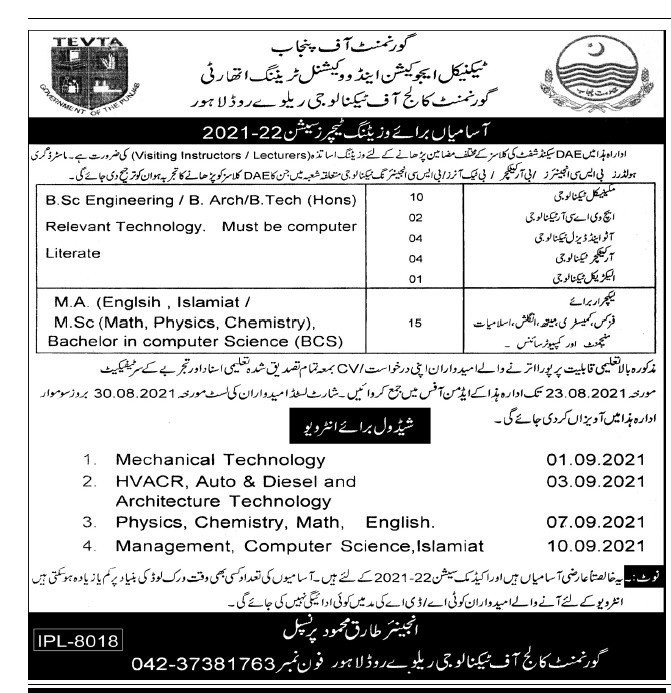 TEVTA Jobs, Teaching/Faculty Positions August 2021
